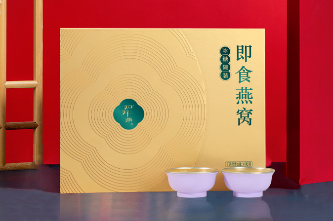 知好燕金盏燕窝即食鱼胶,设计极简、精致,融入中国红色彩,于细节处融合知好燕品牌元素,体现柔和的高级感,增添佳节氛围。